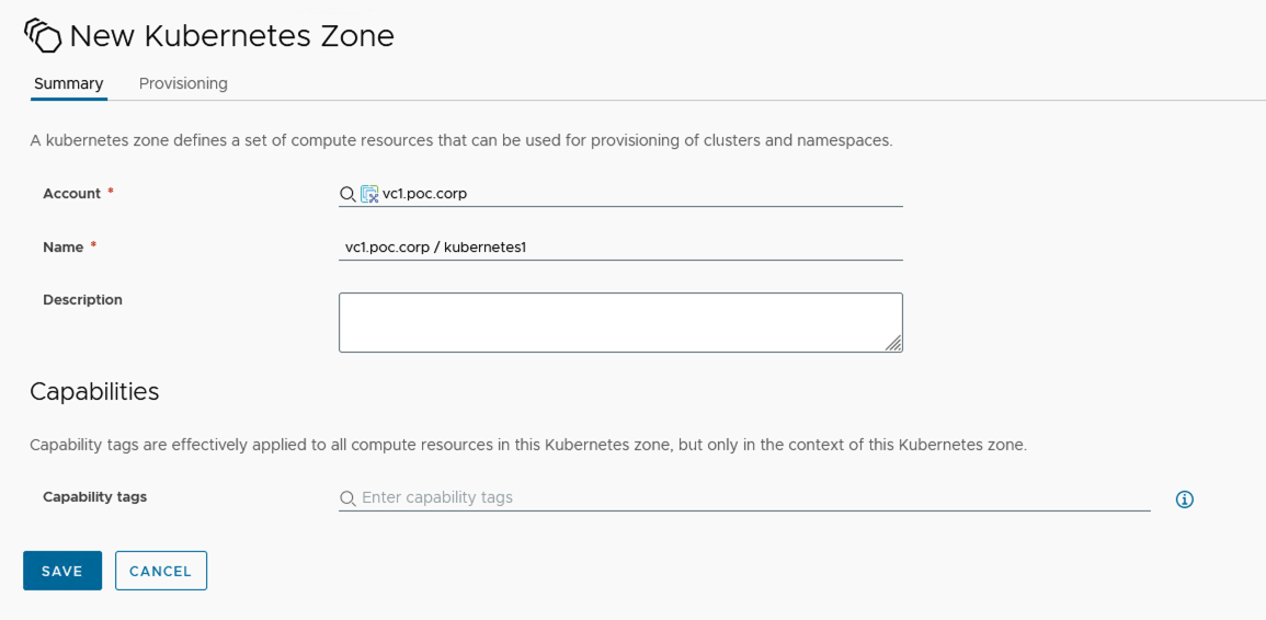 Now click the Provisioning tab to select the supervisor cluster that will be associated with the namespaces.